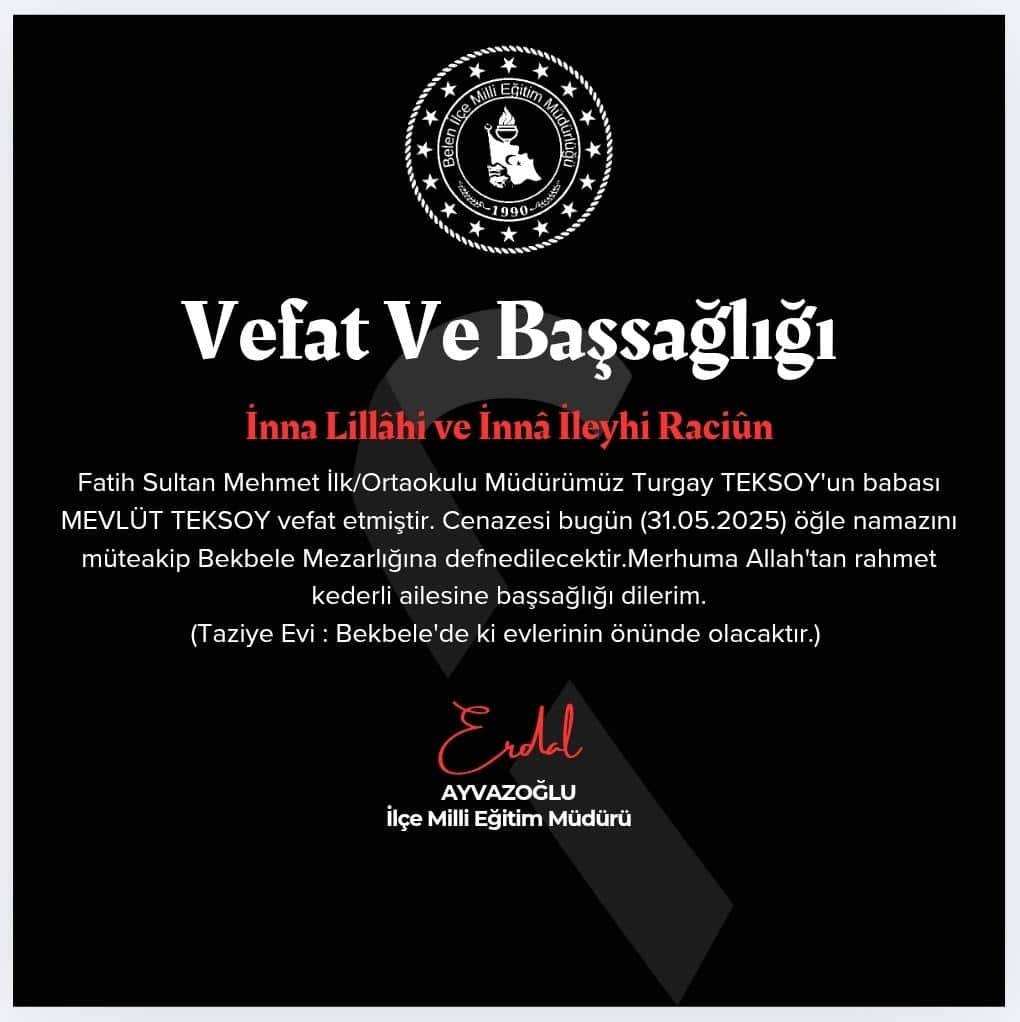 Fatih Sultan Mehmet İlk/Ortaokulu Müdürümüz Turgay TEKSOY'un babası MEVLÜT TEKSOY vefat etmiştir. Cenazesi bugün (31.05.2025) öğle namazını müteakip Bekbele Mezarlığına defnedilecektir.Merhuma Allah'tan rahmet kederli ailesine başsağlığı dilerim. (Taziye Evi : Bekbele'de ki evlerinin önünde olacaktır.)
